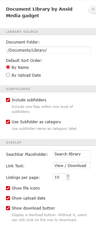 You can find the Document Gadget with the other built in gadgets when editing a page. Simply drag the gadget onto a page and adjust the settings.